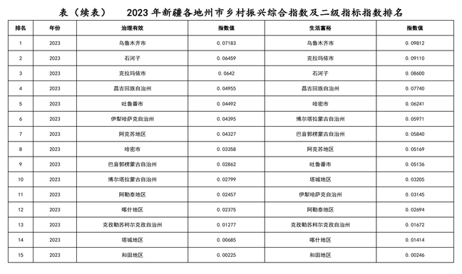 近日,新疆乡村振兴发展指数(第二期)由新疆农业大学乡村振兴研究院正式发布。在遵循科学性、可行性、可测性和数据可获得性原则基础上,该指数以“到2035年基本实现农村现代化”为目标值,在考虑了指标的可量化性以及数据的可获得性的基础上,从产业兴旺、生态宜居、乡风文明、治理有效和生活富裕五个维度构建新疆乡村振兴综合指标体系,涵盖了农业劳动生产率、供水总量、绿化覆盖面积等19个具体指标,将更加全面评价新疆各地州在农村生产、农业发展、人居环境以及乡风建设等领域的发展水平,进而揭示新疆乡村振兴战略整体实施水平。